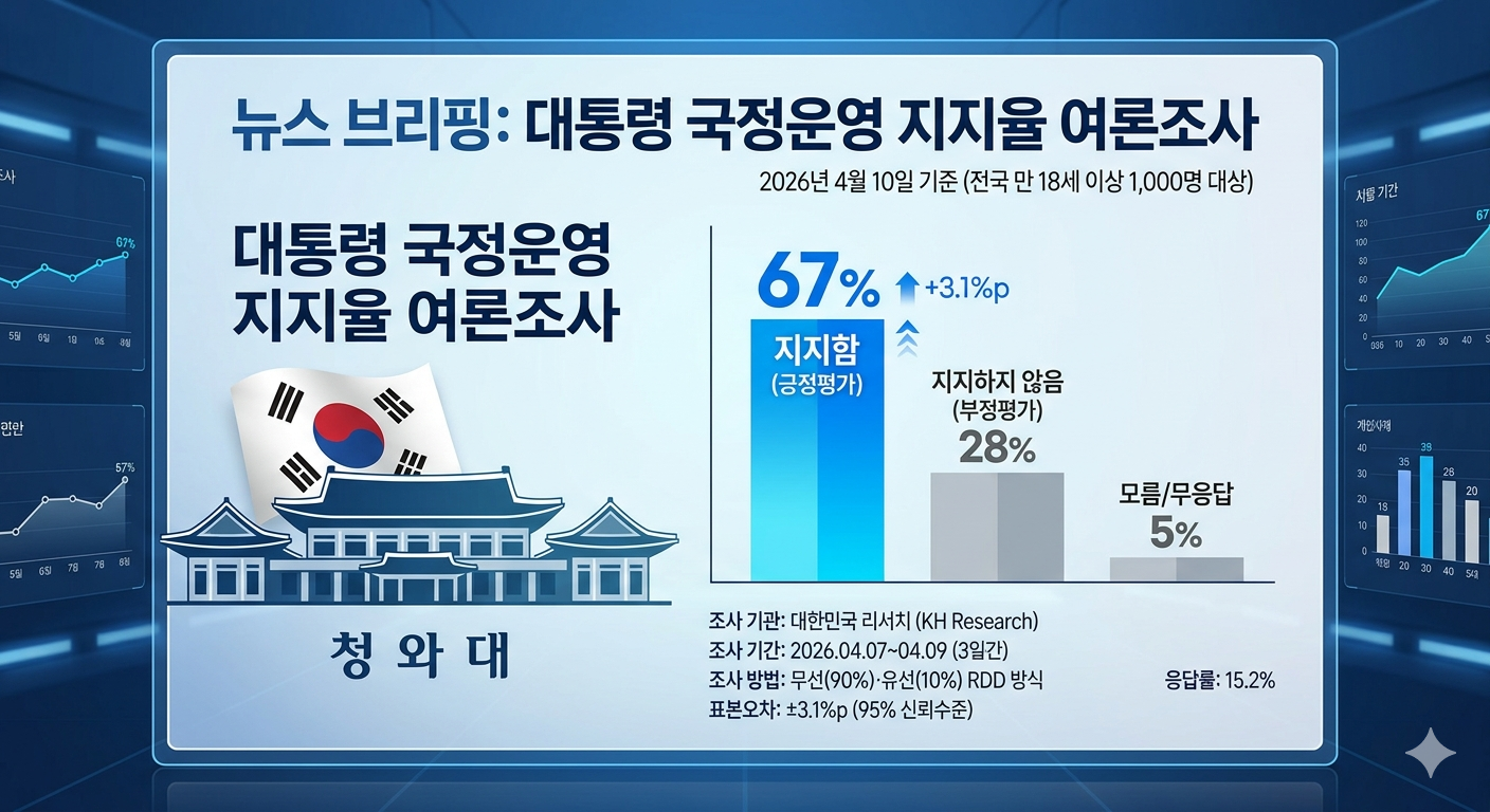 📌 이 글 요약: 한국갤럽이 4월 10일 발표한 여론조사에서 이재명 대통령 국정 지지율이 67%로 취임 후 최고치를 2주 연속 유지했습니다. 보수 텃밭 TK에서도 55%가 긍정 평가했고, 민주당 지지율은 48%로 역대 최고치를 기록했습니다.